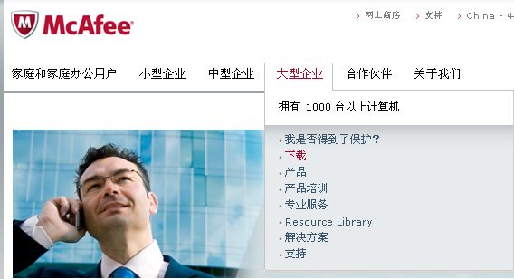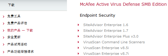 如何在McAfee官网下载McAfee8.7i 在McAfee官网下载McAfee8.7i的操作步骤如下: 首先需要登录McAfee官网页面,然后鼠标放在大型企业–下载 输入有效的授权号并提交 提交之后会来到下面这个页面 单击查看可供下载的产品,就可以下载你所需要的McAfee版本 之后选择VirusScan Enterprise ver.8.7i,根据提示操作即可下载。