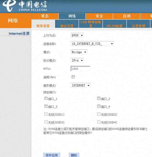 用 telecomadmin 和上面解码的密码登陆光猫,如图新增 WAN 连接,模式选为Bridge,端口不要绑定,设好后重启光猫,试下用电脑可以拨号上网了就说明桥接模式设置成功。